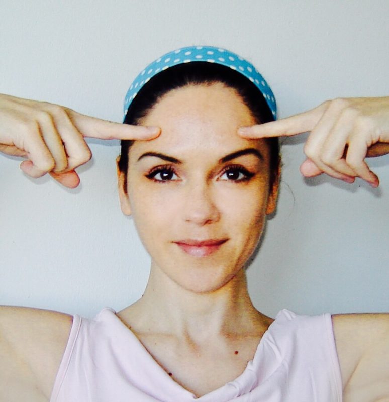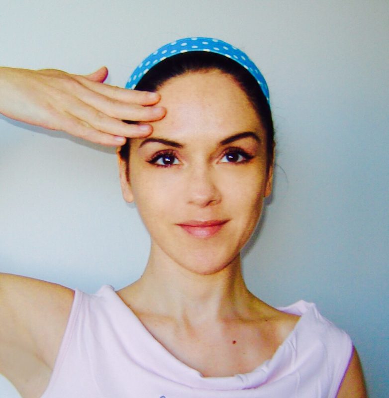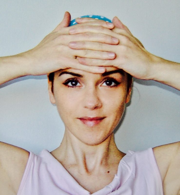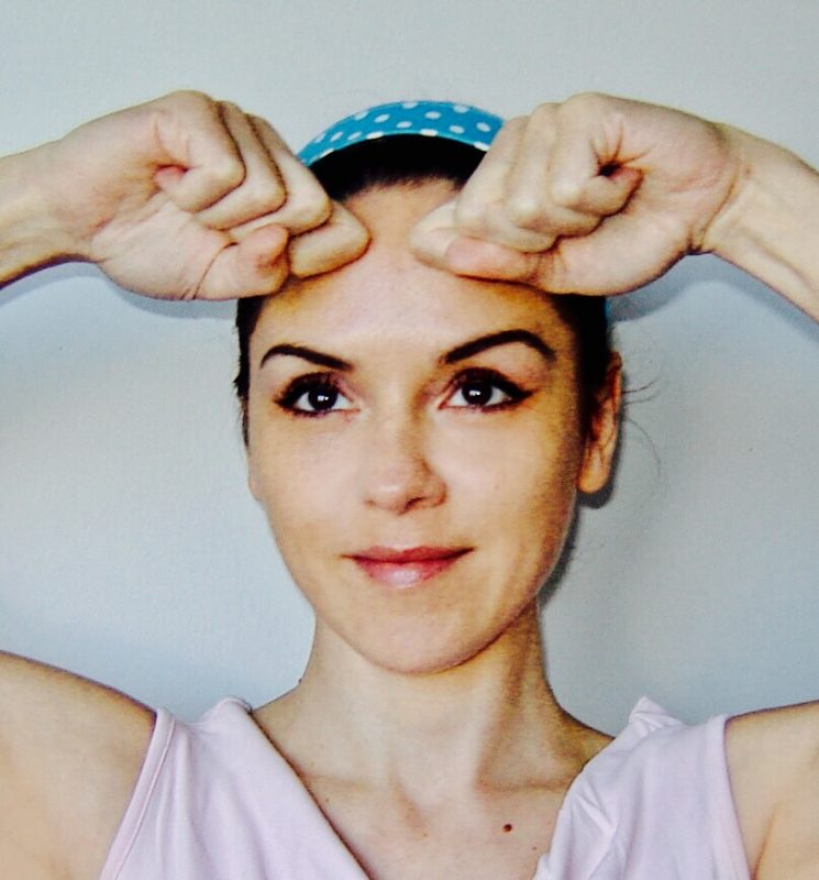 - Z dlanmi izmenično pomasiraj čelo: z levo dlanjo od leve proti desni in z desno obratno, uporabi obe roki, ponovi 10x